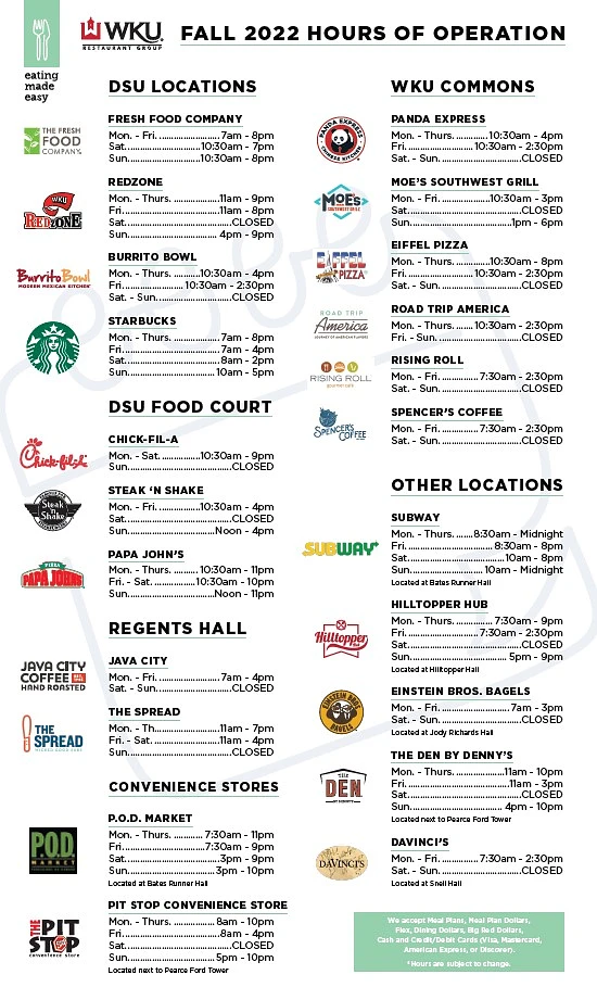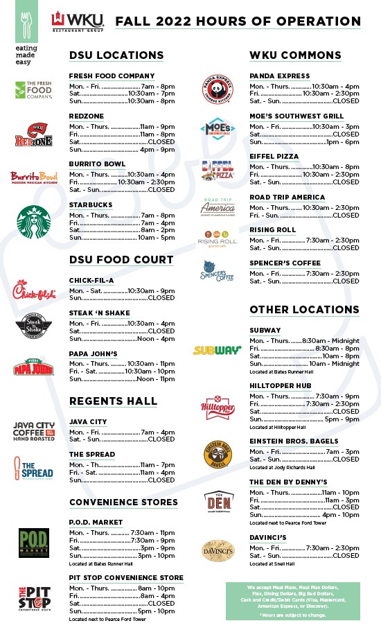 Restaurant locations and hours of operation are also shared on WKU Restaurant Group social media pages as well as posted on our website at www.wku.edu/wkurg.